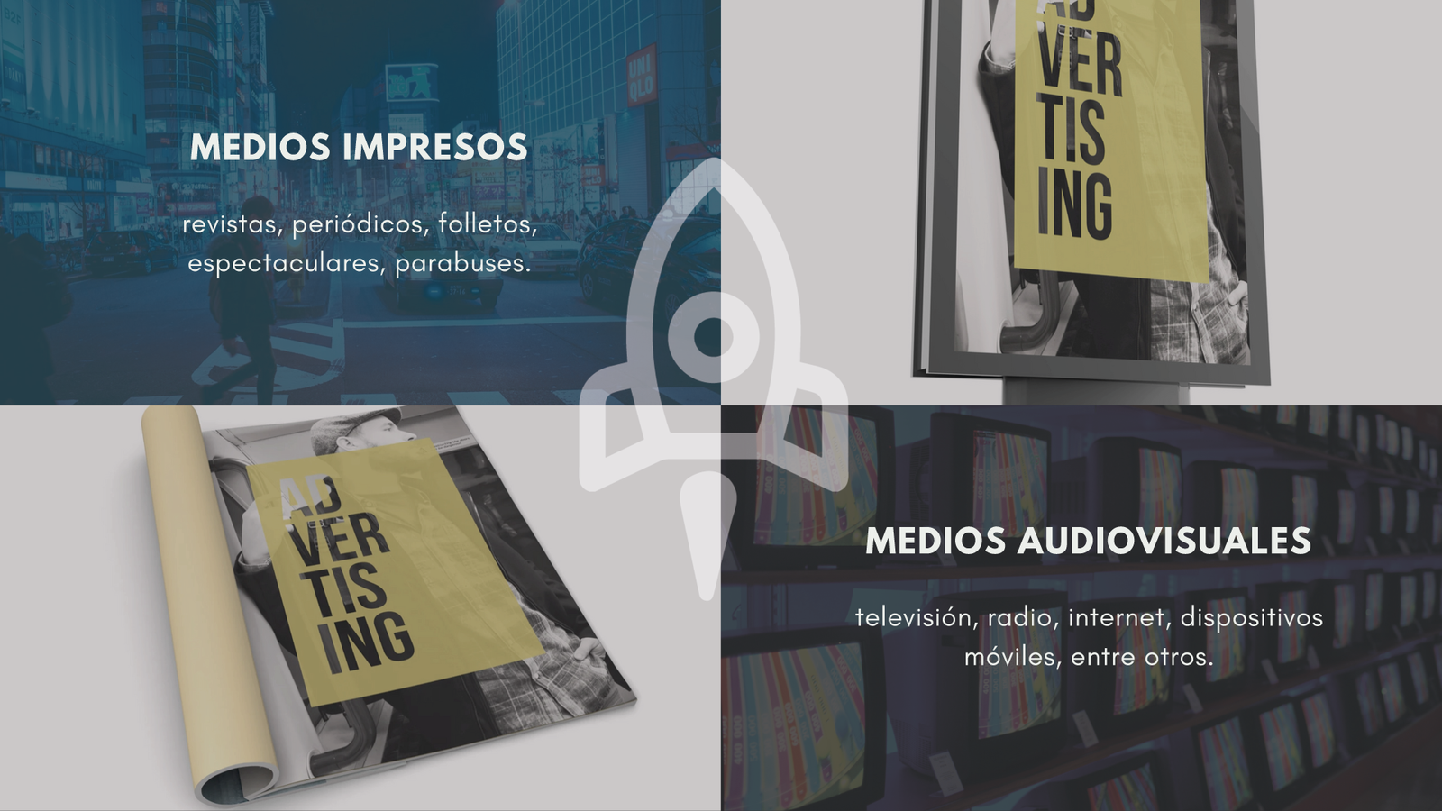 - Medios impresos: revistas, periódicos, folletos, espectaculares, parabuses.